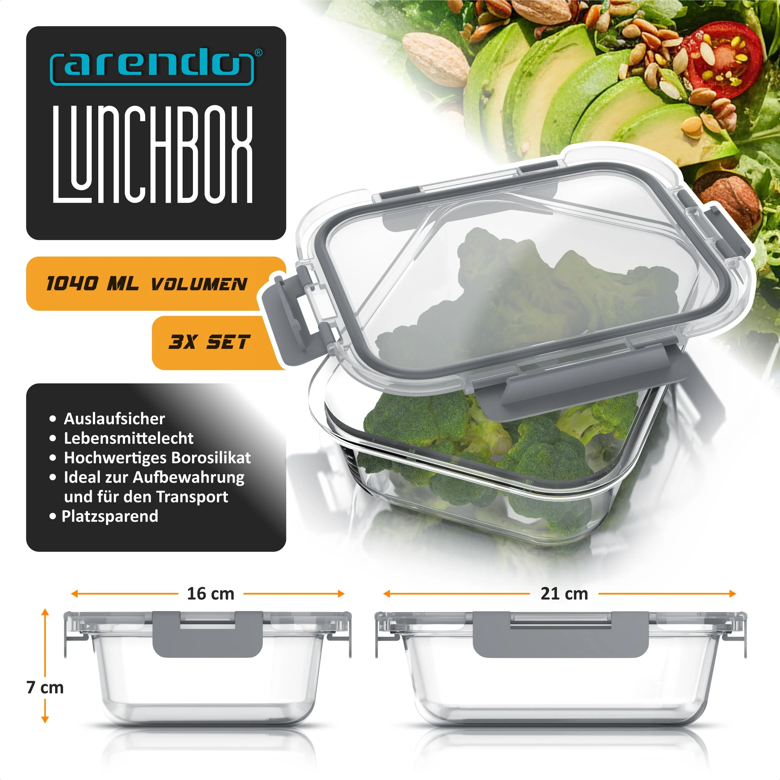 Das 3er-Set Lunchboxen aus hochwertigem Borosilikatglas (je 1040 ml) ist die ideale Transport- und Vorratslösung für den täglichen Gebrauch. Perfekt geeignet zum Mitnehmen von Obst, Salaten, belegten Broten oder Snacks ins Büro, zur Schule oder zum Picknick sowie zur übersichtlichen Aufbewahrung, Vorbereitung und Lagerung von Lebensmitteln.